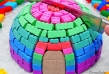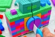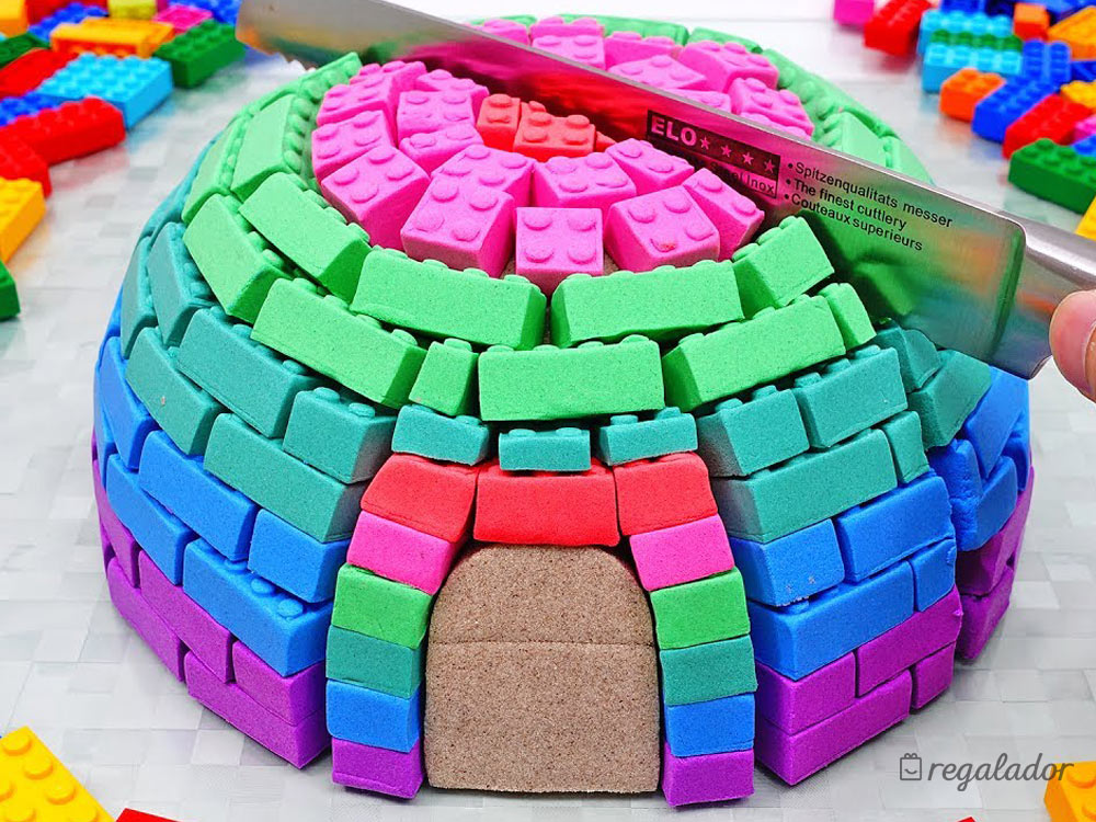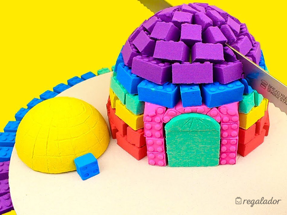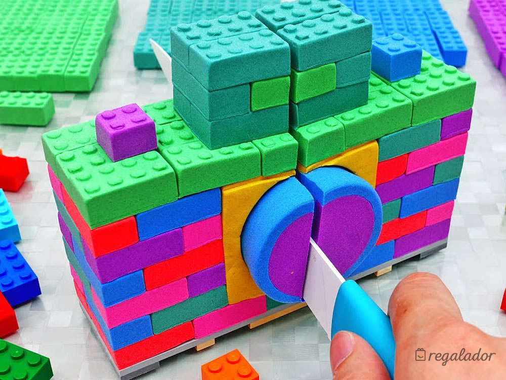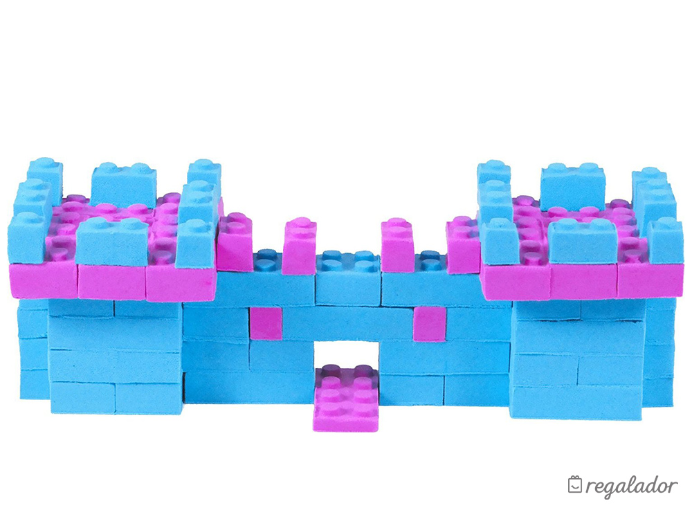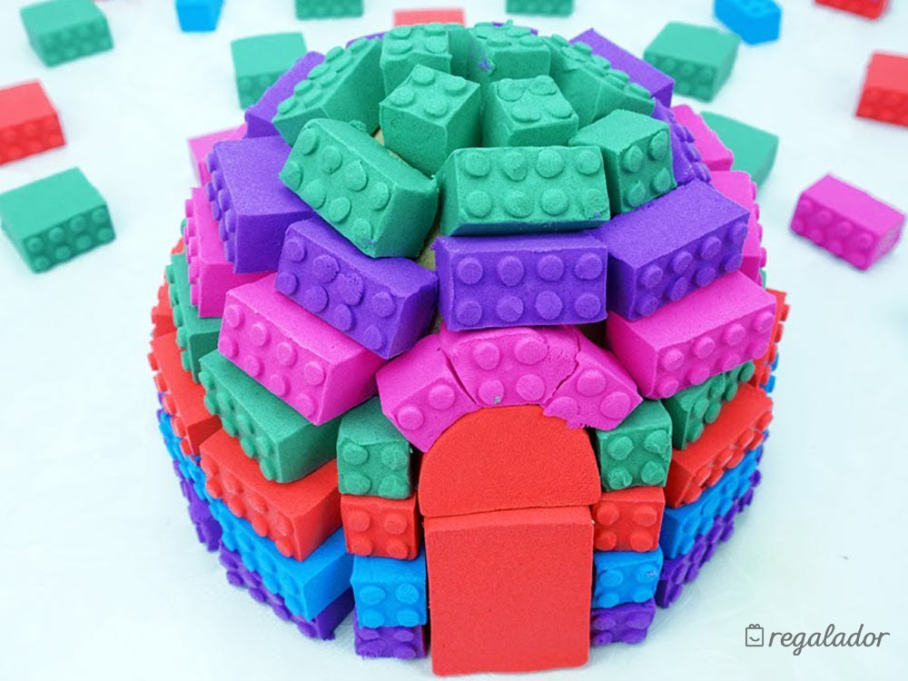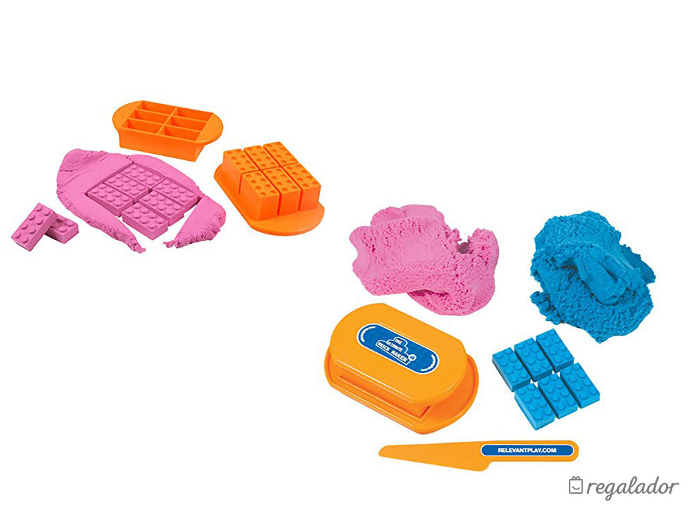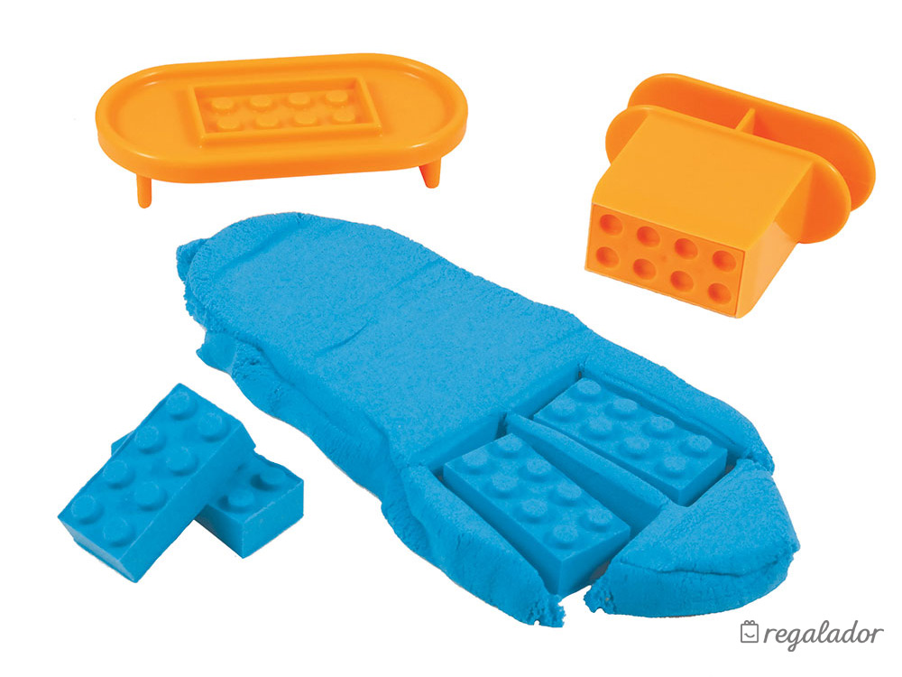 Incluye: Arena azul, arena Rosa y molde para hacer piezas de construcción tipo lego