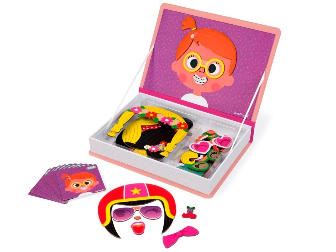 Incluye: 67 piezas magnéticas (ojos, boca, sombrero, pelo, gafas..) y 12 cartas