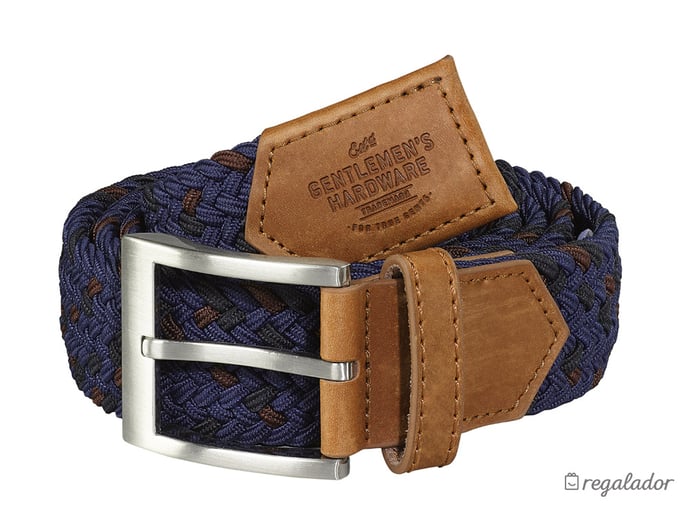 Este cinturón es tan cómodo como elegante porque guarda un secreto en su diseño: el cinturón está realizado en tejido elástico en azul o "marrón burgundy" con detalles de cuero genuino. Así se adapta perfectamente a la cintura y queda como un guante. El diseño se completa con una hebilla de acero inoxidable y el logotipo repujado Gentlemen's Hardware. Y es que efectivamente, este es un cinturón solo apto para Gentlemens.