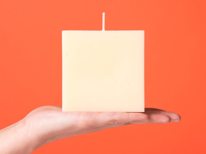 Es una vela muy grande... y ¡personalizable! Sus medidas son de 9,3 cm x 9,3 cm x 3,6 cm